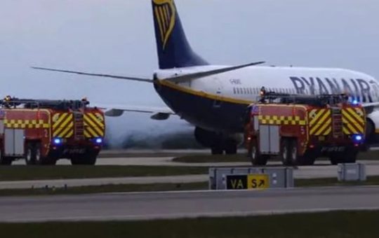 Ryanair blamed a ‘minor technical issue’ for the flight being diverted (Picture: Drones and Planes/YouTube) Fire engines flocked to a...