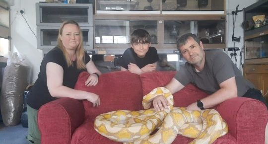 RSG Reptiles owners Susan and Rob Stokes and their son George with the fifth python (Picture: RSG Reptiles) A 16ft...