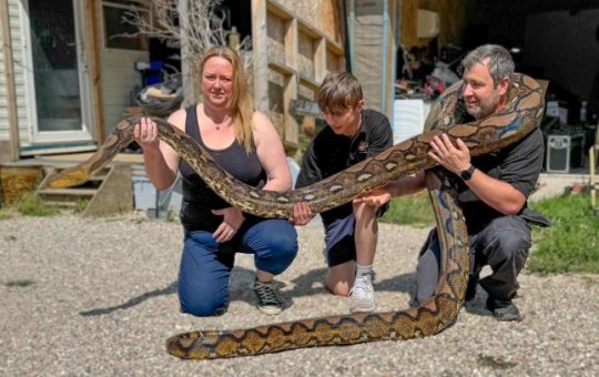 Owners of RSG Reptiles, Susan and Rob Stokes, and their son George with the 18ft reticulated python which has been...