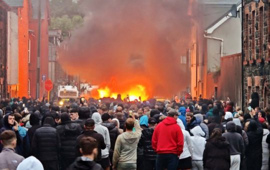 Several fires have been lit in the street Protesters have flung glass bottles and paint cans at riot police after...