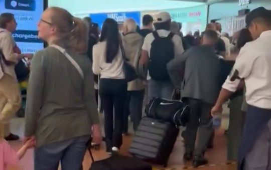Passengers leave the South Terminal departure lounge as an alarm blares (Picture: Emma Harckham) Travellers had to be evacuated from...