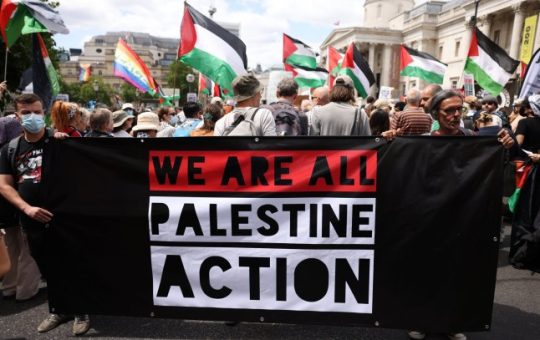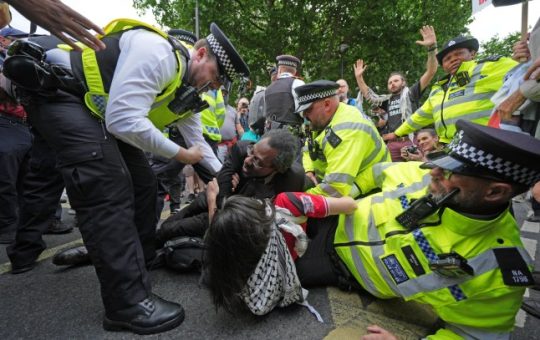 Police officers tussle with people taking part in a demonstration at Trafalgar Square in London.(Pictures: Lucy North/PA Wire) Activists from...