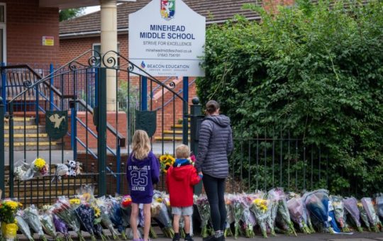 A woman and two children look at floral tributes left outside Minehead Middle School on July 18, 2025 in Minehead,...