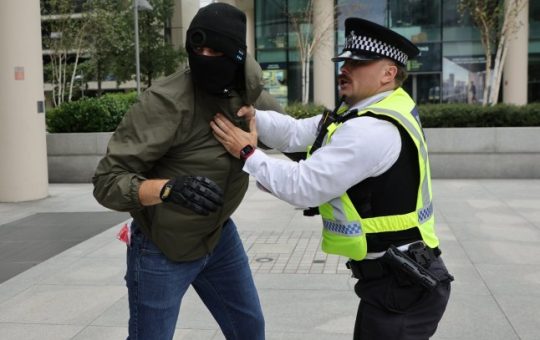 A protester tussles with a police officer outside the Britannia (Credits: George Cracknell Wright) Dozens of balaclava-clad young men appeared...