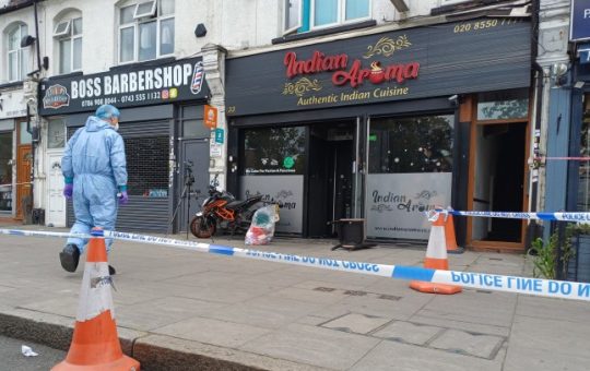 A forensic investigator at a restaurant in Ilford, east London, after two people were left in a life-threatening condition (Picture:...