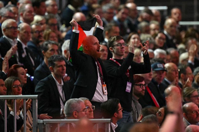 During the Labour Conference today in Liverpool, a man waving a Palestinian flag began shouting, ‘There have been two years of genocide and mass starvation of Palestinians.’