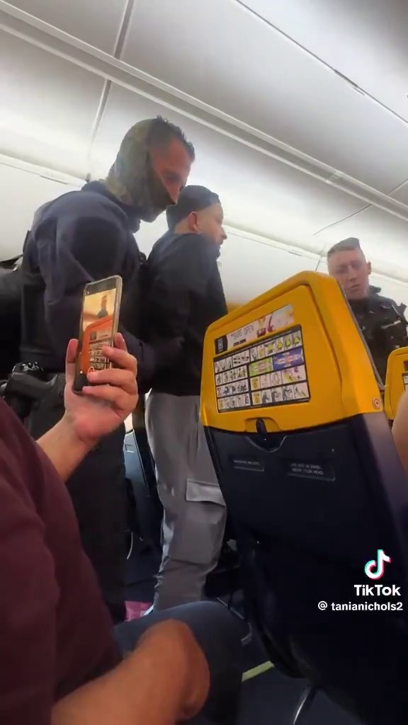 Footage shows a swearing man grappling with armed officers before being led off the plane as passengers cheer and sing ‘cheerio, cheerio, cheerio’.