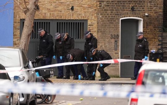 Police officers search the scene on Southern Grove in Ladbroke Grove, west London, after an eight-year-old girl was seriously injured...