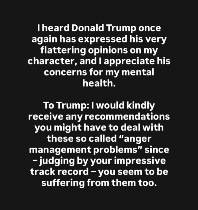 The full response reads: ‘I heard Donald Trump once again has expressed his very flattering opinions on my character, and I appreciate his concerns for my mental health.