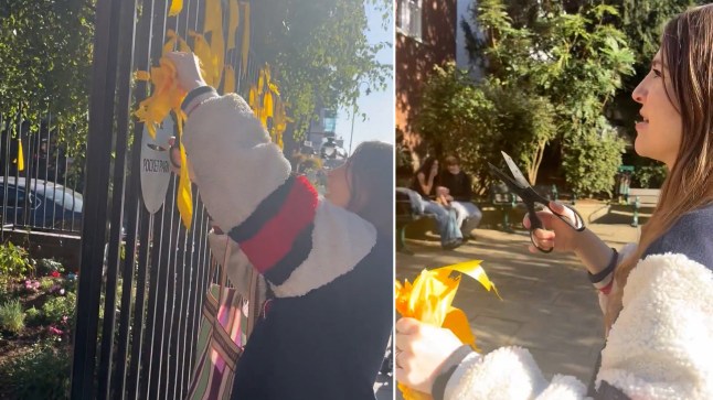 A woman has been caught on camera cutting down yellow ribbons representing hostages taken by Hamas from Israel on October 7.