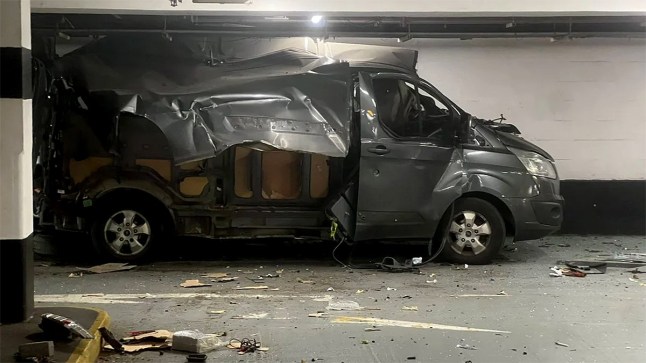 Photographs shared on Reddit from the scene show a mangled grey van inside the car park. The back doors have been blown open, and debris, including scraps of a taillight and a candle lighter, can be seen.