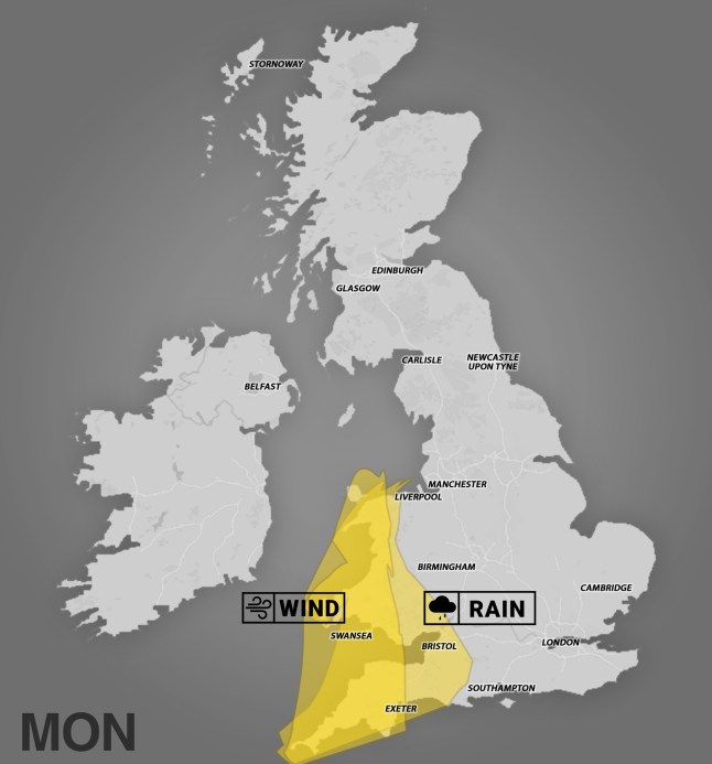 And the bad weather won’t end there – Monday’s wind and rain warnings will remain in place until 4pm on Tuesday.