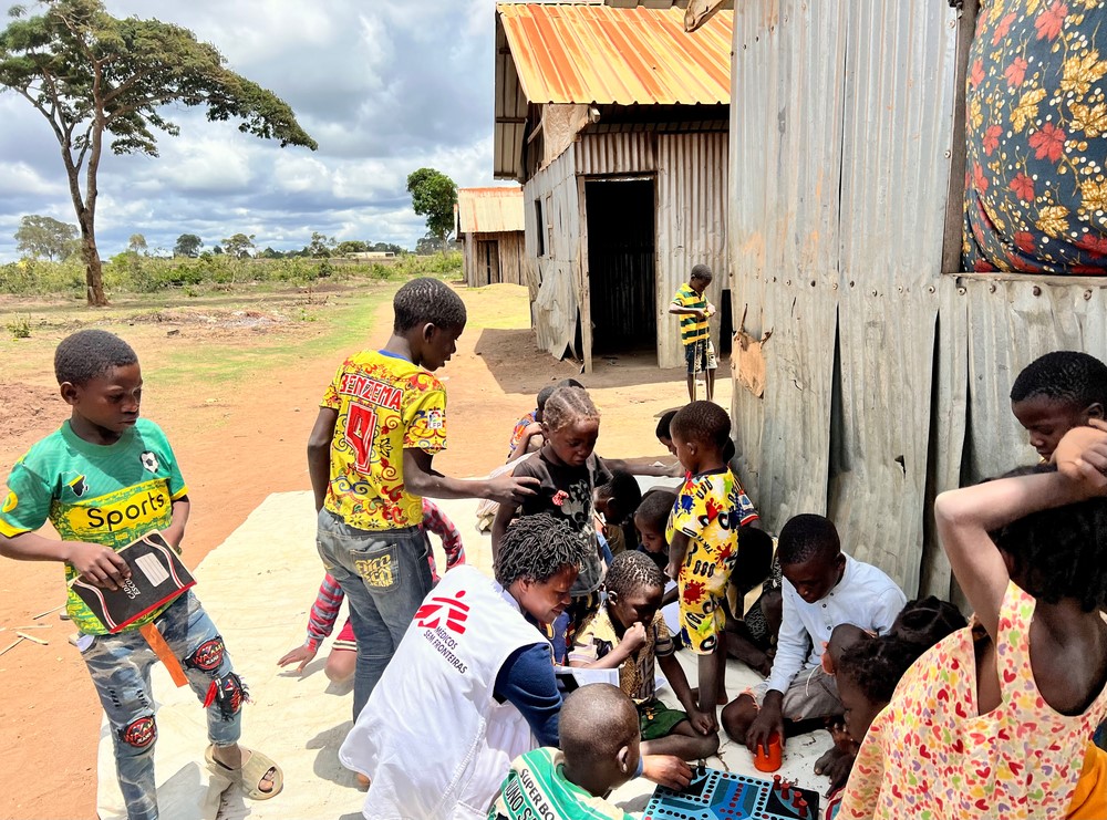An MSF staffer conducts a psycho-education session with children at the Nandimba camp.