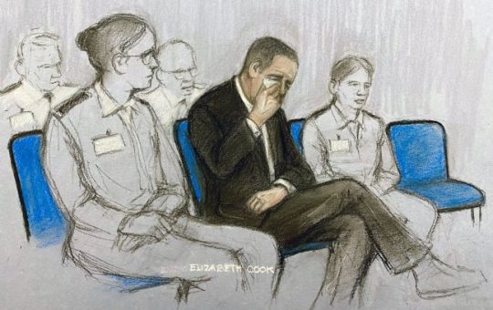 Court artist sketch by Elizabeth Cook of Paul Doyle, wiping away tears as he appears at Liverpool Crown Court during...