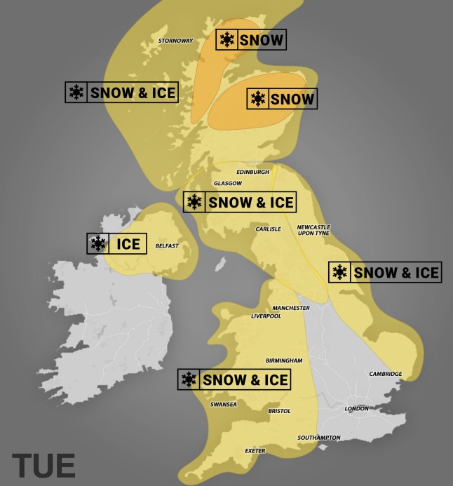 Rain turning to snow will hit Scotland and northern England on Tuesday, with 1–5 cm likely in northern England and up to 10–15cm in central and eastern Scotland, the Met Office said.