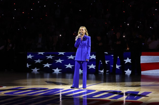 Vanessa Williams sings the US national anthem ahead of the NBA London Game 2026 at the O2 Arena, London.