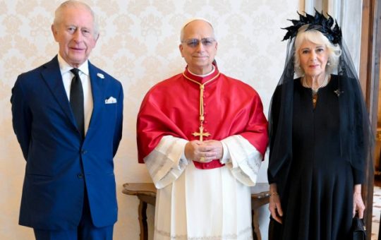 The King and Queen smiled alongside Pope XIV (Picture: AP) King Charles and Queen Camilla have arrived at Vatican City to...