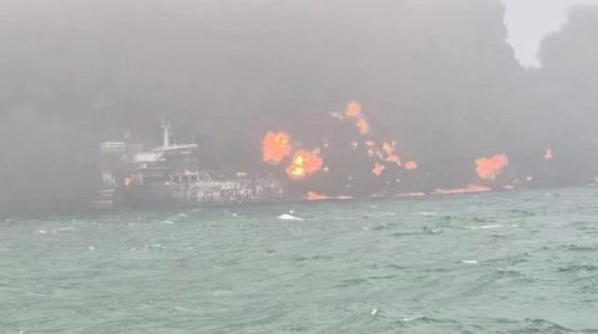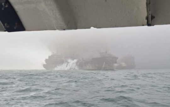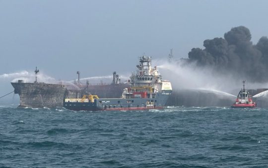 Fire and rescue services attend after a collision between oil tanker MV Stena Immaculate and the cargo vessel MV Solong...